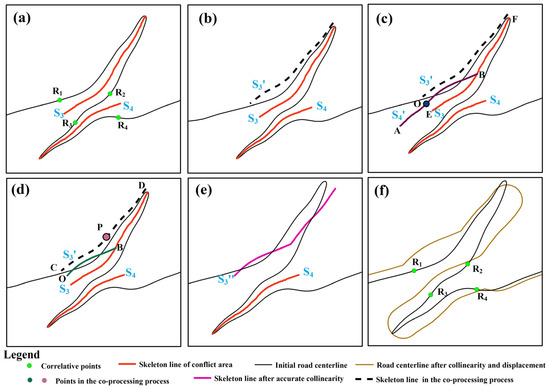 The skeleton line set of this group conflict area is represented as S = {S1, S2, …, Sn}, and n represents the number of skeleton lines in this group conflict area. A subset of the correlative points of skeleton lines on the road centerline is represented as R = {R1, R2, R3, …, R2n}. The two methods for the collaboration between displacement and collinearity are as follows: