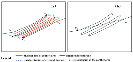 Figure 10. Process of simplification and its collaboration: (a) extraction of skeleton line of conflict area; (b) simplification and its collaboration.