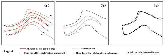 Figure 11. The process of simplification and its collaboration: (a) conflict area, (b) simplification and smoothing operations, and (c) the beam displacement model for collaborative displacement.
