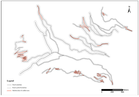 where represents the width of the road symbol, and represents the minimum distance between map objects. When the distance between the skeleton line of a conflict area and that of a neighboring conflict area is greater than , it is regarded as an independent conflict type (called an IC).
