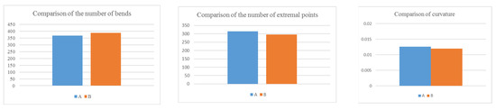 - Shape measures of the roads: Shape measures include the number of bends, the number of extremal points, and the curvature [40]. A comparison of these three shape measures of these roads in this experiment is shown in Figure 16. In Figure 16, A represents the number of shape measures of road objects after resolving road graphic conflicts, and B represents the number of shape measures of the original road objects. |1 − A/B| can explain the degree of change in these three indicators, which was 0.0491, 0.0644, and 0.0461, respectively, in this experiment; these values were very small.