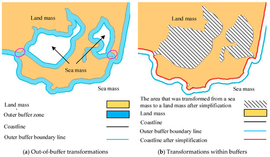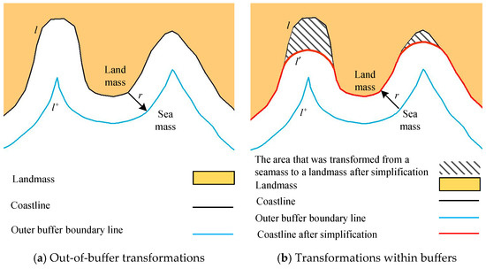 The coastline, as an important line element on nautical charts, has always been the focus of attention in the field of automatic synthesis [1]. Unlike general line element simplification, coastline simplification needs to consider specific principles, such as “expanding land and shrinking sea”, so ordinary line element simplification algorithms are not suitable for coastline simplification [1,2].