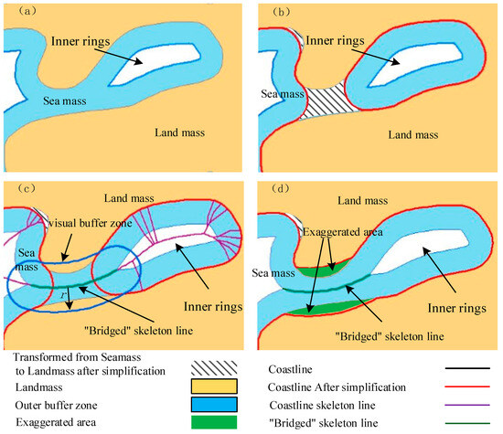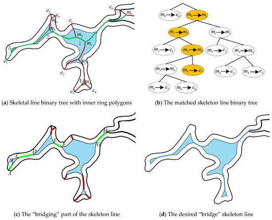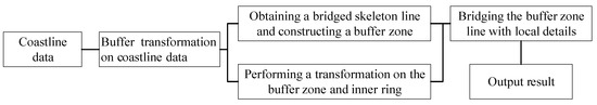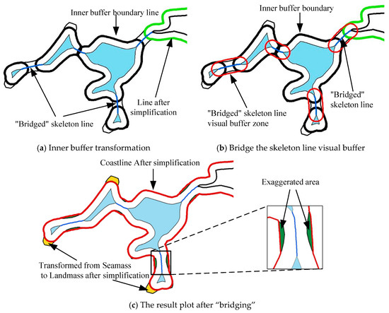 In Section 3.2.3, a detailed description of the extraction of “bridging” skeleton lines is provided. After extracting the “bridging” skeleton lines, the next step is to use them to bridge the simplified coastline results and local details. Combining Figure 9, the specific steps are described as follows.