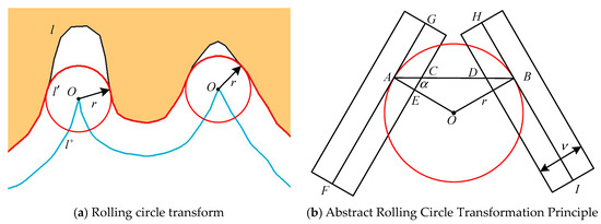 According to the relevant description in reference [27], the bidirectional buffer zone is essentially an approximation of a rolling circle transformation. The simplification process can be viewed as the rolling motion of a rolling circle (as shown in Figure 5a). The outer boundary of the buffer zone is the trajectory of the rolling circle’s center, while the inner boundary (i.e., the final simplified result line) is the movement path of the tangent points between the rolling circle and the coastline to be simplified. Any part that cannot be in contact with the rolling circle is replaced by the boundary of the rolling circle, which is the simplified region. This process can be abstracted, as shown in Figure 5b, where and are local segments of the coastline with a width of . Line segments and are the central lines of the coastline, and circle is a rolling circle with a radius of . Points and are the tangent points between the rolling circle and the central line of the coastline. By connecting these two tangent points and intersecting them with the coastline boundary at points and , we obtain segment , which intersects the coastline boundary at point . According to the principle of rolling circle transformation, the coastline segment to will be simplified.