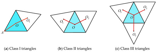 According to the basic idea described in Section 3.1, after performing the outer buffer zone transformation on the coastline, the next step is to extract the “bridging” skeleton line. The extraction of bridging skeleton lines is based on the extraction of coastline skeleton lines, and there are many methods for extracting line element skeleton lines [5,6,7,8,9,10,11,12,13,14,15,16,17,18,31,32,33,34,35]. In this paper, we first construct a constrained Delaunay triangulation network based on the data points on the coastline and extract the triangles located in the sea area. Then, we classify the triangles into three categories (I, II, and III) based on the number of neighboring triangles, as proposed in reference [31], and we connect the skeleton lines between triangles according to their neighboring relationship (the common edge between two neighboring triangles is called a neighbor edge). For I-type triangles, we connect the opposite vertices of the neighbor edges with the circumcenter of the triangle and the circumcenter of the neighboring triangle; for II-type and III-type triangles, we connect the circumcenter of each triangle with the circumcenter of its neighboring triangle. The resulting skeleton lines are shown in Figure 6. Finally, we construct a binary tree of skeleton lines, as described in reference [17] (shown in Figure 7).