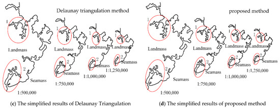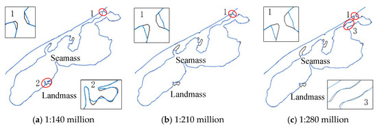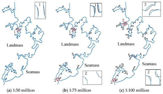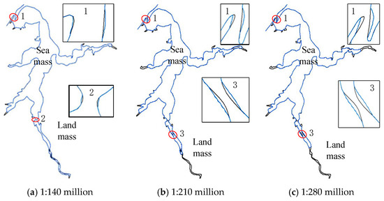 ) represent the original coastline.From the above simplification results, it can be observed that the scale of coastline simplification also gradually increases with the reduction in scale, which is consistent with the progressive simplification principle [17]. The simplified results are relatively smooth and of good quality. As shown in Figure 10, the method proposed in this paper basically maintains the basic shape of the coastline in this area and always retains the estuary (circle 1 in the figure) while appropriately adaptively amplifying the estuary and local narrow areas (circles 2 and 3 in the figure) after reducing the scale. For the lagoon coastline in Figure 11, its most prominent feature lies in whether the lagoon spit (circle 1 in the figure) should be retained. From the figure, it can be observed that the lagoon spit in this area is always retained, and adaptive amplification is applied to both the spit and local narrow areas (circles 2 and 3 in the figure). As for the sea area shown in Figure 12, its coastline distribution is relatively complex, including numerous bottleneck narrow areas and long and narrow curves, providing a good assessment of the effectiveness and applicability of the method. According to the simplification results of the method, this paper takes into account the safety principle of “expanding land and shrinking sea” by performing unilateral simplification on the coastline. After reducing the scale, adaptive amplification is applied to local narrow areas as appropriate.