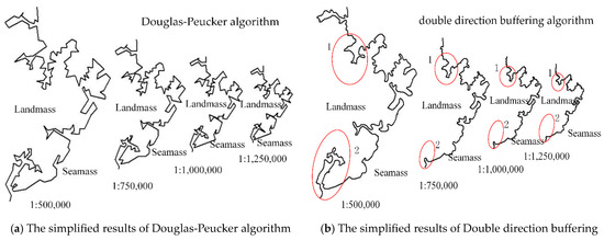 As it can be seen from the above table, both the positive and negative offsets of the Douglas–Peucker algorithm are relatively large. Compared to other methods, the bidirectional buffer zone method has a larger positive positional offset and zero negative offset. This is mainly because this method blocks off a large number of existing “bottleneck” areas (as shown in circles 1 and 2 in Figure 13), resulting in a large area of sea becoming land. In addition, because this method does not have a mechanism to handle “bottleneck” areas, the negative offset is zero. Compared to the Douglas–Peucker algorithm and the bidirectional buffer zone method, the constrained Delaunay triangulation method has a smaller positive offset and higher positional accuracy. The proposed method has a negative offset that is basically the same as the constrained Delaunay triangulation method, and it has the smallest positive offset, closely following the original coastline and achieving high positional accuracy compared to the other three methods.
