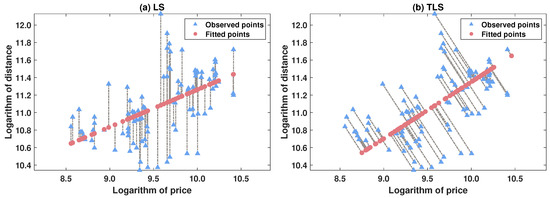 To give the reader an impression of the basic idea of TLS, we here consider a simple example published by Wooldridge [63] (p. 153). It tries to investigate the relationship between the logarithm of the house price and the logarithm of the distance from the house to an incinerator. Therefore, the model consists of two parameters, i.e., the intercept parameter and the distance parameter. We select the first 100 sampled points and fit the data with LS and TLS, respectively. The estimated results are shown in Figure 1, from which we can see that LS only adjusts the data in the vertical direction. In contrast, the direction of the residuals produced by TLS is orthogonal to the fitted line. The essential reason is that TLS considers the random errors in the distance and adjusts such quantities in the estimation. This is why TLS is called orthogonal regression in some studies.