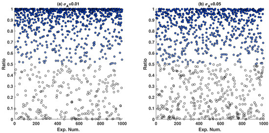 With , we consider two experiments by setting and , respectively. In each experiment, the following steps are conducted 1000 times.