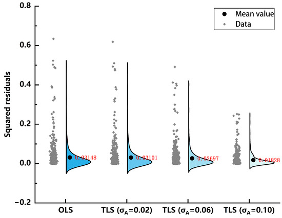 The purpose of this experiment is to verify that TLS can provide a more accurate parameter estimator than OLS. We set and varied from to with increments of , conducting a total of 20 experiments to show such an improvement at different noise levels. In order to show the statistical performance, the experiment with a specific noise level was replicated 500 times [68].