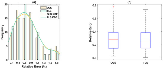 - For and , the RMSEs of TLS are comparable to those of OLS. However, we can see that the magnitudes of the RMSEs of these two parameters are much smaller than those of the other three parameters (particularly , the intercept). In terms of the sum of the RMSEs, TLS significantly outperforms OLS, achieving a improvement with .