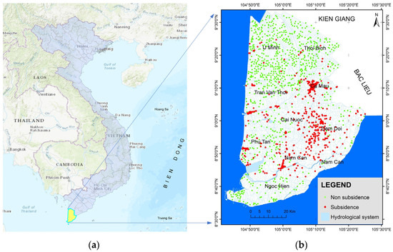Ca Mau research area on the map of Vietnam. (a) Vietnam map; (b) the boundary of Ca Mau Province is overlaid with the hydrosystem layer, along with sample points utilized in the subsidence susceptibility prediction model.