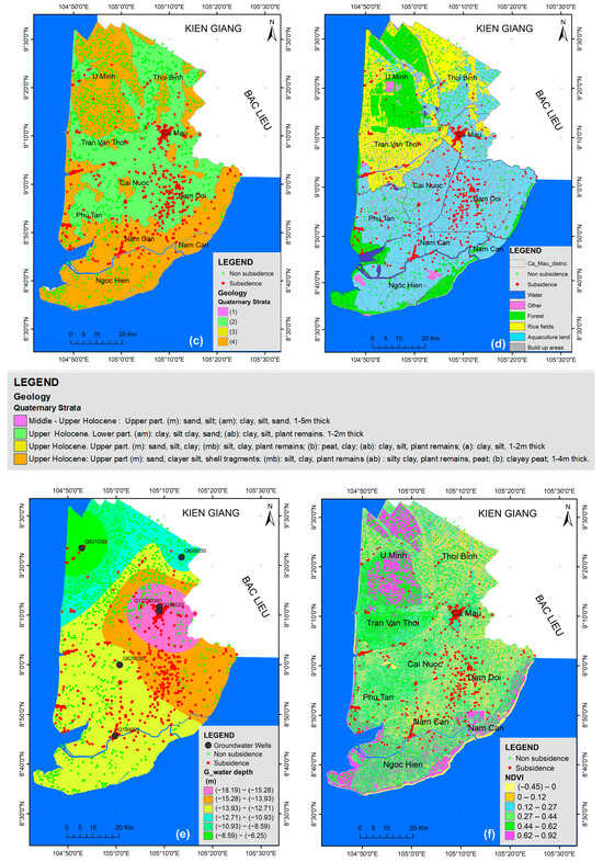 According to research conducted by Ngoc et al. (2021) [24], the Mekong Delta provinces are characterized by Holocene sediments primarily composed of soft clay, ranging in thickness from a few meters to over 20 m, and occasionally exceeding 30–40 m. Ca Mau Province, a coastal lowland and a relatively young sedimentary area, exhibits thinner layers of soft clay compared to the interior provinces. The geological map with quaternary strata of Ca Mau is a 1:100,000 scale map provided by the Vietnam Institute of Geology and Mineral Resources and has been selected as an influence layer of the land subsidence susceptibility prediction model [25].