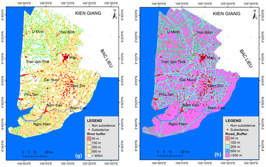 Furthermore, as previously mentioned, the distribution of subsidence susceptibility is mainly concentrated along traffic routes, particularly in the area stretching from Ca Mau City to the south. While the river system in this region is notably dense, its influence on subsidence susceptibility appears to be negligible. This explains the higher impact level of roads in comparison to rivers (see Figure 6).