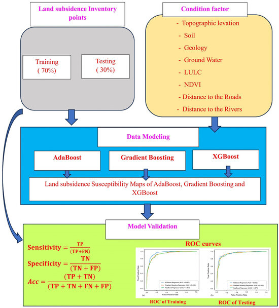 The subsidence data consist of 2011 PSI points incorporated into the model. Additionally, eight influential data layers, namely elevation, soil type, geology, groundwater, land use and land cover (LULC), normalized difference vegetation index (NDVI), distance to roads, and distance to rivers, are included. When employing machine learning models, the dataset is split into two distinct parts: the training and the testing. This division is crucial for evaluating the model’s performance on new data not previously encountered during training. The training set constitutes 70% of the input data, while the testing set comprises the remaining 30%. Within the dataset, values are labeled as 1 (indicating the presence of subsidence) or 0 (indicating non-subsidence). Figure 5 depicts the process of constructing a prediction model utilizing three boosting methods: AdaBoost, Gradient Boosting, and XGBoost. Python served as the programming language used for this research.