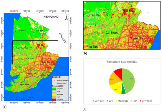 The XGB model was utilized for predicting a land subsidence susceptibility map, and the result was exported as TIFF file and further refined using ArcGIS 10.8 software. Employing a classification method to categorize data classes manually in ArcGIS 10.8, the subsidence susceptibility map was divided into five levels, namely “Very Low”, “Low”, “Moderate”, “High”, and “Very High”, corresponding to values “<0.3”, “0.3–0.5”, “0.5–0.7”, “0.7–0.9”, and “0.9–1”, respectively [39]. The distribution of subsidence susceptibilities from the XGB model is illustrated in Figure 8. In this figure, the map illustrates the subsidence susceptibility across the province (Figure 8a), and a closer view of an area exhibiting significant subsidence around Ca Mau City and some adjacent districts to the city’s south, as shown in Figure 8b. Additionally, we calculate the percentage of subsidence susceptibility based on the categorized levels as depicted in Figure 8c.