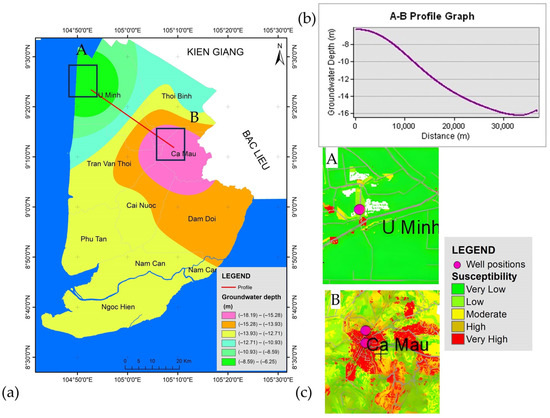 Related to the depth of the groundwater, the profile (A–B line) (Figure 9b) is taken (Figure 9a), revealing that the groundwater depth has significantly decreased in the Ca Mau City area compared to the U Minh area. The decline in groundwater levels is a major contributing factor to land subsidence. Therefore, the possibility of land subsidence in the Ca Mau City area is very high, and this has been shown very clearly on the subsidence susceptibility map made from XGB.
