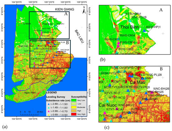 To further assess the validity of the land subsidence susceptibility predictions generated by the XGB model, 31 subsidence points measured using second- and third-order leveling techniques were utilized. These points were not utilized during the model-building process; instead, they were solely employed to evaluate the model’s accuracy. Elevations of these points were measured in two periods: 2005 and 2020. The subsidence rate, expressed as the change in elevation over 15 years, is presented in the “Subsidence rate/year” column in Table 5. The greatest subsidence values are predominantly concentrated in the center of Ca Mau City, extending along the roads. These subsidence values were then classified into different levels for comparison with the subsidence susceptibility map generated by the XGB model: “Very Low”, “Low”, “Medium”, “High”, and “Very High”. Average annual subsidence values exceeding −1.5 cm/year were categorized as “Very High”, while values ranging from −1 cm to −1.5 cm were classified as “High”, and so forth. These measurement points were then overlaid onto the subsidence susceptibility prediction map generated by XGB. The blue color on the map indicates that leveling points with high subsidence values are concentrated in Ca Mau City and districts such as Dam Doi and Nam Can. Some points with high subsidence (cyan) are situated along traffic routes, with many distributed in the southern region of Ca Mau City. Additionally, several points in the northern part of Ca Mau City are depicted in Figure 10b. In this area, there are points III(CH-HP)1 and II(SC-PL)18 with level measurement values showing high subsidence, but in the map, the subsidence susceptibility is low and very low. This shows that errors in predicted results using XGB have appeared in this area.