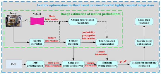 The module adopts a non-blocking architecture to enhance real-time performance, meaning that semantic information extraction operations are not performed for every frame of the image. Instead, when the semantic thread is idle, the system detects the latest frame in the sliding window and extracts semantic information only for that frame. For frames without extracted semantic information, feature point motion probabilities can be estimated using epipolar geometry constraint algorithms and motion probability propagation models. Considering the weak robustness of pure visual SLAM algorithms and the unaffected output of IMU sensors by dynamic objects, this paper further investigates a method that combines visual and IMU information to determine the static or dynamic nature of feature points. This method is implemented in the second module, the feature optimization algorithm based on visual–inertial coupling. The module utilizes the prior information provided by the coarse segmentation module to perform motion consistency checks in order to correct the erroneous motion probability estimates of feature points from the coarse segmentation module. This correction process improves the positioning accuracy of the algorithm. The system framework diagram is shown in Figure 1.