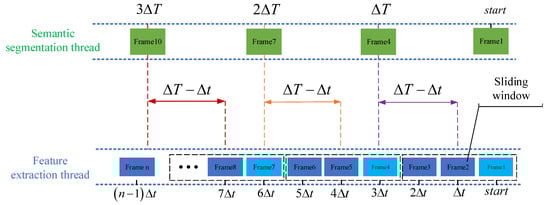 To improve the efficiency of feature point optimization, this paper adopts a parallel semantic information-extraction thread parallel to the feature-extraction thread, drawing inspiration from conventional semantic SLAM models [22]. Utilizing the concept of a sliding window model [4], when extracting features from all frames within the sliding window, the semantic information of only the most recent frame in the window needs to be extracted. As shown in Figure 2, assuming the time for feature extraction per frame is and the time for semantic information extraction per frame is , if a blocking model is used, after the feature extraction of frame n is completed, the waiting time required would be . As time progresses, the accumulation of the waiting time becomes significant, leading to a loss of real-time tracking capability. In contrast, when a non-blocking model is used, only the semantic information of the latest frame in the sliding window needs to be extracted. Consequently, the waiting time becomes a fixed value, , and does not accumulate over time. Frames that have not undergone semantic extraction will be classified based on the semantic information extracted from the frames within the sliding window. Compared to the blocking model, the non-blocking model imposes lower performance requirements on the onboard processor. Even if the processor fails to perform semantic segmentation, thus affecting the tracking process, it does not impact the overall system performance.