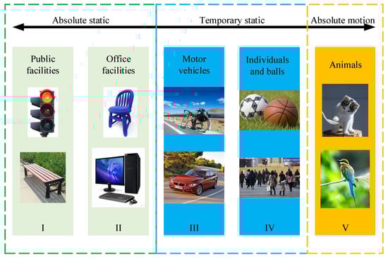 In this paper, based on life experience, we have categorized the labels provided by the COCO dataset [23] into five major classes, where the higher the probability of movement, the higher the level, and conversely, the smaller the probability of movement, the lower the level. As shown in Figure 3, the first category is designated as public facilities, including objects like traffic lights, signs, and benches. The second category includes household or office items such as books, desks, chairs, and sofas.