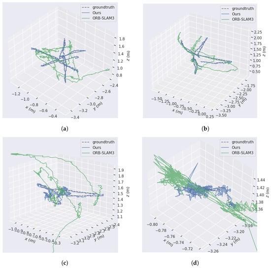 Results of the (a) fr3/walking/xyz, (b) fr3/walking/halfsphere, (c) fr3/walking/rpy, and (d) fr3/walking/static sequences for the TUM dynamic RGB-D datasets. We compared the trajectories estimated by our methods and by the original ORB-SLAM3 with the ground truth.