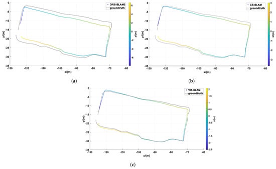 Comparison of localization trajectory results for (a) ORB-SLAM3, (b) CS-SLAM, and (c) VIS-SLAM.