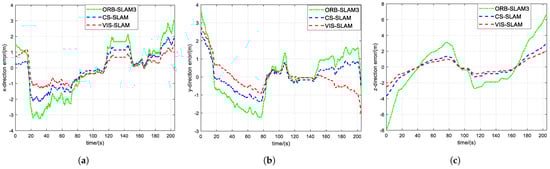 To validate the feasibility of the algorithm, this section conducts experiments based on the market dataset and compares the localization results of three algorithms: ORB-SLAM3, Coarse Segment SLAM (CS-SLAM) based on deep learning for motion coarse segmentation, and our method (VIS-SLAM) based on visual–inertial tightly coupled feature optimization. Figure 8 illustrates the localization results of the three algorithms on the market dataset.