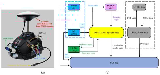 As shown in Figure 11a,b, the hardware devices and deployment framework for the experimental setup are illustrated. In this experiment, all sensor data were communicated and shared through the Robot Operating System (ROS) [33]. The image data were acquired using a camera sensor, specifically the Realsense D435i camera, in monocular mode. The left-eye image information was utilized, with an image resolution of 640 × 480 and an input frequency of 30 Hz. The IMU information was provided by the built-in IMU module of the Realsense D435i camera. The output frequencies of the accelerometer and gyroscope were both set to 200 Hz. The u-blox module, in combination with the NTRIP module, provided corrected latitude, longitude, and altitude information.