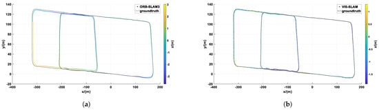 The algorithm proposed in this paper is an improvement over the ORB-SLAM3 algorithm [31]. To validate the performance of the improved algorithm, we compared it with the ORB-SLAM3 algorithm in terms of localization accuracy on the dataset. The results are shown in Figure 7. Additionally, we also calculated the root-mean-squared error (RMSE) for both algorithms in terms of the absolute trajectory error (APE) and relative trajectory error (RPE) [32], and the results are summarized in Table 1, Table 2 and Table 3.