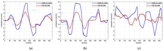 In this paper, real-time RTK data were used as the ground truth for comparing the localization accuracy between ORB-SLAM3 and the proposed algorithm. Figure 12 and Figure 13 present the localization results of the two algorithms and the error comparison in the three-axis directions. Table 5 presents the root-mean-squared errors (RMSEs) for each algorithm in different directions.