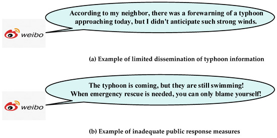 In the environment of big data, people are increasingly keen to use the internet to acquire knowledge about disasters [4,5,6,7]. At present, individuals commonly employ search engines to query relevant web pages and gather the required information [8,9]. Despite the efforts of various search engines to satisfy information retrieval needs, users are still limited to keyword searches and must sift through numerous search results. Furthermore, the complexity of disaster risks, coupled with the limitations of individual cognition, strengthens the public’s challenge in accurately understanding natural disaster risks. The two examples shown in Figure 1 illustrate the above situation. First, the channels through which the public receives typhoon information are limited and often unreliable. As Figure 1a shows, even though there is a wealth of data and forecasts on typhoons, this information may not be widely disseminated or accessible to the public. Consequently, it is difficult for community members to obtain accurate and authoritative disaster information. Second, despite the existence of disaster prevention and mitigation measures, along with science popularization materials, insufficient disaster cognition still hinders accurate judgment during actual disasters. As Figure 1b shows, communities often fail to assess risks accurately and take appropriate actions in the face of disasters. Therefore, when a disaster approaches, it is first necessary to organize and sort disaster information orderly to ensure accuracy and authority. Furthermore, it is crucial to efficiently communicate disaster information to the public and remind them to take timely preventive preparations.