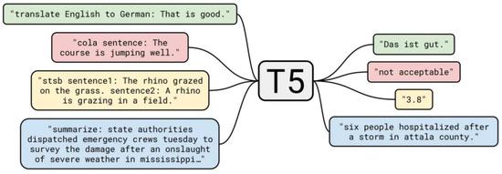 T5, or “text-to-text transfer transformer”, adopts the transformer’s encoder–decoder structure. It is a universal framework proposed by Google in the pretrained model domain [53]. It employs a stack of self-attention layers instead of traditional RNNs or CNNs to handle variable-length input sequences. When provided with an input sequence, it is mapped to an embedding sequence in the encoder. These encoders share the same structure, each consisting of the following two subcomponents: a self-attention layer followed by a small feed-forward neural network. Layer normalization is applied to the input of each subcomponent, and residual skip connections add the input of each subcomponent to its output. Dropout is applied to the feed-forward networks, skip connections, attention weights, and the input and output of the entire stack. The decoder works similarly to the encoder as follows: after each self-attention layer, there is an additional attention mechanism to process the output of the encoder. The final output of the decoder block is passed through a dense layer to generate the output probability of the vocabulary. Unlike the general transformer model, the T5 model uses a simplified form of positional embedding, where each embedding is a scalar added to the corresponding logit used to compute the attention weights. As the authors pointed out, to improve efficiency, they share positional embedding parameters among all layers. T5 has the following two main advantages over other advanced models: (1) it is more efficient than RNNs because it allows parallel computation of the output layer and (2) it can detect hidden and distant dependencies between tokens without assuming that nearby tokens are more relevant than distant ones. This attribute is particularly important for tasks related to text generation, because words with the same semantics may be far apart.