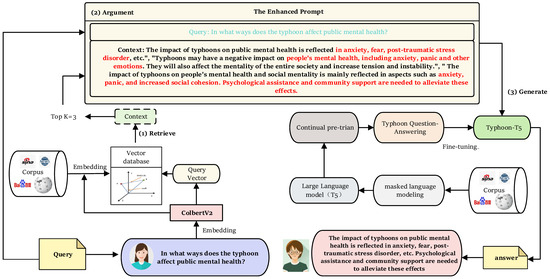3. Prompt argument based on RAG. The RAG technique enables LLMs to enhance their outputs with information from external knowledge sources. This process improves accuracy, ensures contextual relevance, and minimizes errors in generated responses. Specifically, we use the ColbertV2 (https://huggingface.co/colbert-ir/colbertv2.0 (accessed on 11 February 2024)) [55] model to convert the corpus knowledge into a vector database for storage. When a user makes a query, we embed the user’s query into the same vector space as the vector database. Through similarity searches, we retrieve and return passages semantically related to the queries. These passages are then integrated into the prompt as contextual information. The enhanced prompt is then input into the Typhoon-T5 model, which has been fine-tuned in Step 2. This allows the model to generate detailed and targeted responses, providing users and emergency responders with relevant information. The specific implementation method is shown in Figure 4. It is noteworthy that the integration of typhoon disaster information significantly strengthens the T5 model’s capability for comprehension of geographical spatial features. This advancement enables a more comprehensive and in-depth analysis of text information related to typhoon disasters.