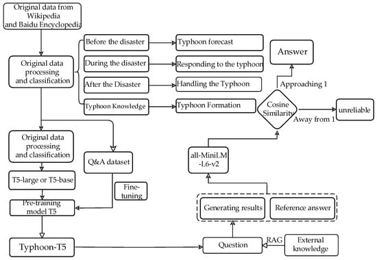 During the data collection phase, the acquired data are rigorously screened to remove duplicate, inaccurate, and irrelevant information to ensure data quality. To obtain the pretraining data set, we employed masked language modeling to format the data according to the training needs of the T5 model. For the construction of the fine-tuning data set (typhoon Q&A pairs), we designed a series of questions related to typhoon disasters from different levels and perspectives. Subsequently, we used open-source projects on GitHub (https://github.com/SupritYoung/free-self-instruct (accessed on 11 February 2024)) to extract answers matching the questions, which built a data set of 2204 typhoon-related Q&A pairs. The data set is divided into training, testing, and validation sets in a ratio of 70:20:10 for model fine-tuning purposes. Moreover, to further enhance model response quality, we employed RAG technology, which retrieves passages from the typhoon corpus that are semantically similar to user queries, as context to enhance prompts. Finally, to assess the response quality of the Typhoon-T5 model, we randomly selected questions from the test set and generated answers through the Typhoon-T5 model. The experimental flowchart is shown in Figure 5.