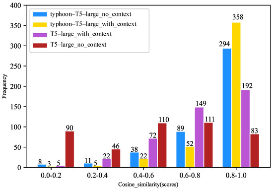 Model metric evaluation refers to a method of assessing model performance or predicting results using quantitative metrics. In the field of natural language processing, model metric evaluation typically involves using various metrics to quantify model performance, which aims to provide quantitative measures of model performance on specific tasks. From the perspective of semantic similarity, we adopted the ‘all-MiniLM-L6-v2’ model. Through several sets of comparative experiments (Group 1: typhoon-T5-large_no_context, Group 2: typhoon-T5-large_with_context, Group 3: T5-large_with_context, and Group 4: T5-large_no_context), we conducted an in-depth investigation into the performance of the proposed method (Group 2 experiments) in the ’all-MiniLM-L6-v2’. As shown in Figure 6, the experiments in Group 3 and Group 4 showcase the performance of the T5-large model with and without typhoon knowledge guidance. It is evident that when guided by typhoon knowledge, the model’s responses have a higher cosine similarity with reference answers in the high-score range. Conversely, without typhoon knowledge guidance, the model’s responses display a higher cosine similarity with reference answers in the low-score range. This is because the model lacks sufficient information for guidance, which results in the inability to generate answers that match the reference answers. Under the influence of the RAG task, the model retrieves passages with higher semantic similarity to the user queries as context prompts, akin to an “open-book exam”. The model can fully utilize these contextual cues to generate more accurate and reliable answers. Therefore, a retrieval-based Q&A method demonstrates superior quality and reliability. In the experiments of Group 1 and Group 3, the Group 1 experiment integrates typhoon knowledge into the T5-large model through continuous pretraining. It is observed that, in the trustworthy range of 0.8 to 1.0, the model with integrated typhoon knowledge performs more effectively. This observation may be caused from various factors. Primarily, through fine-tuning, typhoon-related knowledge is integrated into the model and stored implicitly within its weights. Consequently, when users make queries, the model can effectively utilize all available information to respond to questions. The results are more comprehensive and accurate outcomes. Additionally, the RAG task involves integrating retrieved knowledge explicitly into prompts, which enables the model to respond to user queries based on this information. However, due to the inherent limitations of the RAG task, there may be poor quality of the recalled text, potentially leading to misleading model responses. This indicates that incorporating typhoon disaster knowledge through fine-tuning results in superior response outcomes compared to retrieval-based methods, which enhances its effectiveness in addressing unknown questions. The comparison results between Group 1 and Group 2 experiments reveal that the Group 2 experiment incorporates domain knowledge into the model and retrieves passages semantically similar to the question as context to guide Typhoon-T5 in generating responses. It is apparent that responses generated in this manner predominantly fall in the high-score range and less so in the low-score range. Consequently, the incorporation of typhoon disaster knowledge into LLMs, along with the inclusion of contextual information into the prompt, enhances the credibility, flexibility, and interactivity of the generated responses. However, this approach is more complex, which necessitates higher hardware configuration and greater computational resources for model training and fine-tuning.