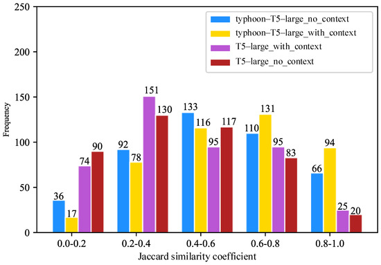 From the perspective of set-based similarity calculation, we employed the Jaccard similarity coefficient method. To standardize the representation of text, we converted all text to lowercase. This helps reduce calculation errors caused by differences in character casing and punctuation. The experimental results are shown in Figure 7. It can be observed that the number of high-score intervals in the Jaccard index is significantly lower than that of the ‘all-MiniLM-L6-v2’ model. Through specific case analysis, it was found that the Jaccard index only considers the cooccurrence of words. This neglects semantic and word order information, which leads to the inability to capture deep semantic correlations in the text. For example, for the query: “‘In-Fa’ caused Heavy downpour in Henan, and how many people died?”, the model generated the result: “The ‘In-Fa’ brought Heavy downpour to Henan before it made landfall, which causes the deaths of 302 people”. The reference answer is “The ‘In-Fa’ caused 302 deaths”. From this example, it can be seen that both the generated result and the reference answer can accurately answer the user query, with differences only in semantic richness. Therefore, the Jaccard index generally remains low. Nevertheless, our proposed method still exhibits a higher frequency in the high-score intervals compared to other models, with a lower frequency in the low-score intervals.