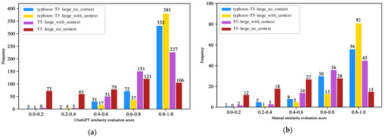 Recent studies [61,62] have utilized LLMs for vertical domain evaluation tasks. These studies have empirically demonstrated that the evaluation of ChatGPT is consistent with manual evaluation. In this work, we used ChatGPT to avoid intensive labor. Specifically, given standard answers and answers generated by the T5 model, ChatGPT is prompted to return similarity scores. Finally, the frequencies of all scores in each interval are aggregated, as shown in Figure 8a.