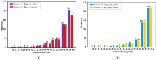 To further validate the performance of our method across the T5 models with varying parameter sizes, we specifically focused on the models’ effectiveness in parsing user questions and generating responses related to typhoons. For instance, we consider questions like “When did Typhoon ‘In-Fa’ make landfall?” and “How much economic loss did Typhoon ‘In-Fa’ cause?” To explore this, we conducted experiments using the T5-large model, which has a parameter size of 770 M, and the T5-base model, which has a parameter size of 248 M. Evaluated using cosine similarity. In Figure 9a, “typhoon-T5-large_no_context” demonstrates a performance improvement over “typhoon-T5-base_no_context”. This suggests that a larger parameter size enables the model to retain more knowledge details, which results in superior responses to user questions. On the other hand, as shown in Figure 9b, while “typhoon-T5-large_with_context” shows improved performance relative to “typhoon-T5-base_with_context”, the degree of improvement is not as significant. This may be attributed to the relatively limited size of the typhoon disaster knowledge data set that we studied. While T5-large captures more fine-grained details during training, T5-base successfully compensates for deficiencies in response generation by retrieving contextual information. Therefore, the results are not significantly different from T5-large in terms of performance. This also indicates that when optimizing the application of LLMs in the geoscientific domain, selecting an appropriate parameter size can not only generate excellent results but also reduce hardware requirements and save computational resources. This also underscores that optimizing the application of LLMs in the geoscientific domain, which involves selecting an appropriate parameter size, can not only generate excellent results but also reduce hardware requirements and save computational resources.