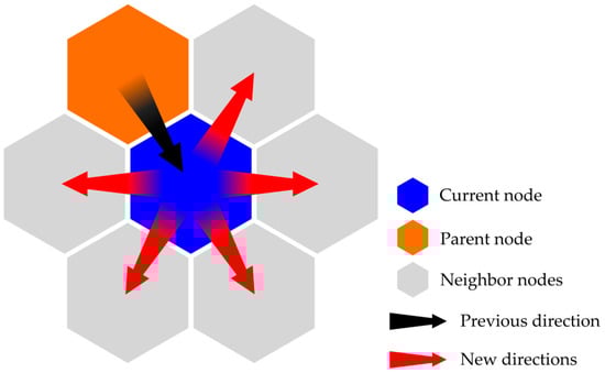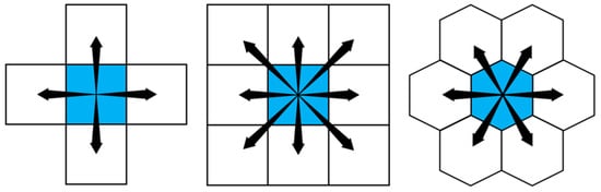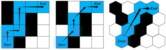 In a two-dimensional plane, squares, equilateral triangles, and regular hexagons uniformly cover all areas [11]. Conventional grid-based methods rely on square grids. Figure 1 illustrates the movement pattern in different grid maps, where the blue nodes indicate the current node, the white nodes indicate the neighboring nodes and the black arrows indicate the directions of movement. As illustrated in Figure 1, in a square grid, the target can move from the current node to a neighboring node in either four or eight directions. If a diagonal movement is not allowed, there are only four directions: forward, backward, left, and right, each with a movement cost of one unit. The 8-directional square grid map includes four diagonal directions, resulting in two different movement costs: 1 unit and √2 units. Therefore, when calculating the paths based on this map, it is necessary to determine the category of the forward direction, which makes the calculation extremely complex. However, the hexagonal grids feature only six target directions, each with a movement cost of one unit.