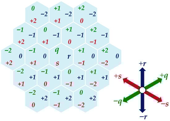 Heuristic algorithms require the calculation of distances between nodes, and the distance calculation involves the assistance of a coordinate system. Common hexagonal grid coordinate systems include cubic, offset, and axial coordinates. Among these, the cubic coordinate system is easy to understand, and its distance calculation formula is simple and clear. Therefore, a cubic coordinate system was adopted for the distance calculation. In contrast to the x- and y-axes in the Cartesian coordinates for square grid maps (as shown in Figure 3), the cubic coordinate system has three axes: q, r, and s, representing the grid coordinates as (q, r, s).