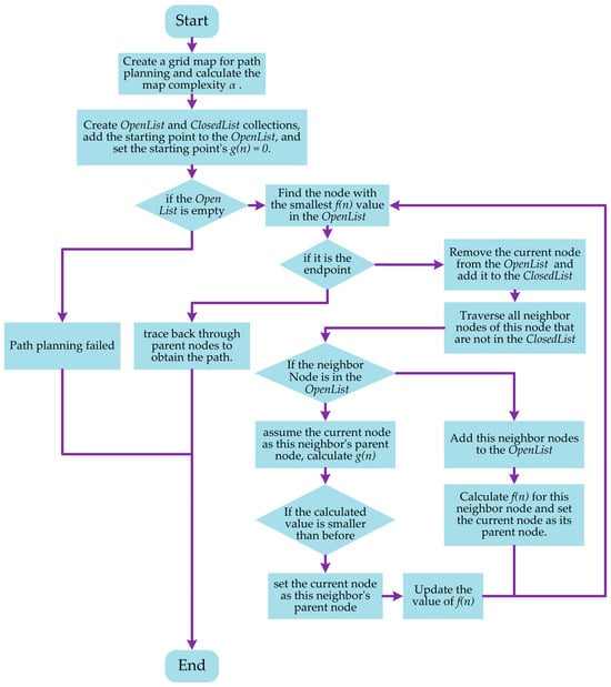 Pathfinding algorithms can be classified into blind and heuristic categories based on whether they use heuristics. Blind algorithms conduct searches based on predetermined strategies without considering the characteristics of the map or destination. Examples include the breadth-first search (BFS) and Dijkstra’s algorithm. However, heuristic algorithms utilize estimated costs to reach the destination, calculating heuristic values to expedite the search. Representative examples include greedy and A* algorithms. The most typical one is the greedy algorithm, which selects the node with the minimum estimated cost to reach the destination at each expansion step. The A* algorithm combines the features of both Dijkstra’s and Greedy’s algorithms with its heuristic function, defined as