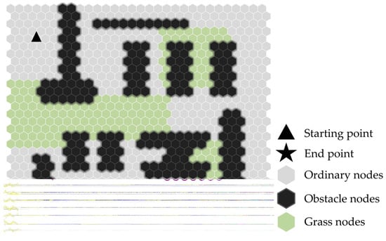 To verify the performance of the improved A* algorithm proposed in this study, we simulated it using the Unreal Engine 5 (UE5), version 5.0.3. UE5 is a powerful game development engine increasingly used by researchers for developing navigation systems, making it an excellent software tool for the experiments conducted in this study. We constructed an experimental map of size 30 × 30, which included 191 obstacle nodes and 248 grassland nodes, with the influence factor K set to 1. Through calculations using Equation (7), the complexity α of this map was determined to be 0.35. The map and selection of the start and end points are shown in Figure 7. In the figure, gray nodes represent ordinary nodes, light green nodes represent grass nodes, and black nodes represent obstacle nodes. The black triangle marks the starting point of the path, and the black pentagon marks the endpoint of the path.