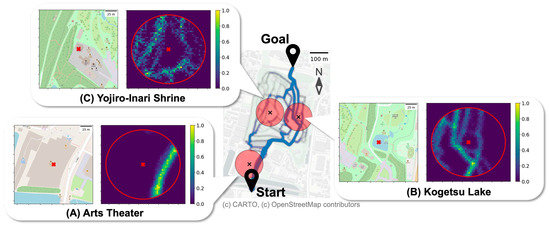 The simulation field is set in Senshu Park, located in the center of Akita City, Japan. The park features a walking trail surrounded by beautiful nature. Synthetic trajectory data points (blue), target POIs (x-mark), and scanning spaces with a 75 m radius (red circle) displayed in the figure are based on the EPSG:6691 coordinate system. This study selected three areas with different point patterns for GPS tracking: (A) Arts Theater, (B) Kogetsu Lake, and (C) Yojiro-Inari Shrine. The density values in heatmaps are normalized, ranging from 0.0 for the minimum value to 1.0 for the maximum value of each area. The area of POI (A) depicts the simplest patterns, while the area of POI (C) presents multiple and complex density structures.