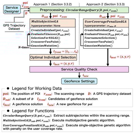 The workflow and data flow for the automatic geofence design process, from data input by a service designer to geofence determination, are illustrated in the diagram. The external entity is highlighted in blue. The workflow consists of three main phases: preprocessing (green), geofence determination (orange), and service quality check (pink). Working data are illustrated using red symbols. The processes of the genetic algorithms (Approaches 1 and 2) are detailed in Section 3.3.2 and Section 3.3.3.