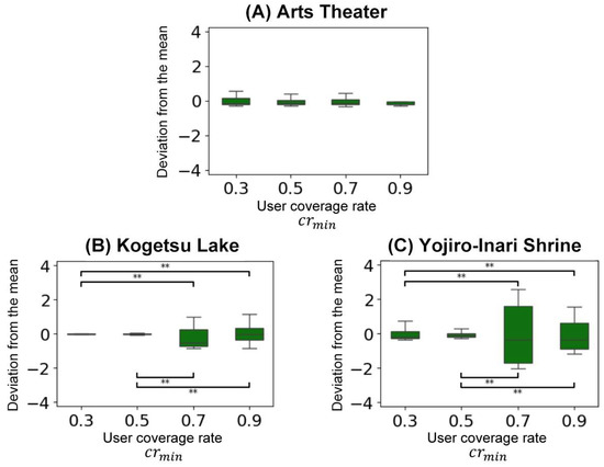 This figure shows the results of the deviation of the fittest value from the mean after 30 trials for each POI at different minimum user coverage rates, suggesting that (1) higher minimum user coverage rates lead to more unstable results and (2) more random point patterns also yield unstable results. In this study, the Fisher’s F-test was employed to assess the equality of variances across multiple group pairs. The F-test compares the variances between each pair of groups, and under the null hypothesis, it assumes that the variances within each pair are equal (**: p < 0.01).