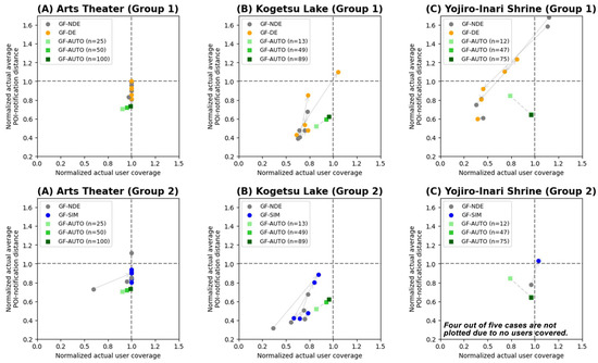 Figure 8 shows the results of the evaluations. Groups 1 and 2 were separately plotted for three areas. For any target POI, the user coverage rates of GF-AUTO resulted in high values (approximately 1.0). According to the Pareto front outlined in Section 4.1, the average POI-notification distances were likely the most optimal values within the solution spaces. However, additional data appear to be needed for appropriate geofence settings, especially in areas where pedestrian flows are randomly scattered. For example, in the area of POI (C) for Group 2, GF-AUTO with limited training data could underperform compared to manual settings.