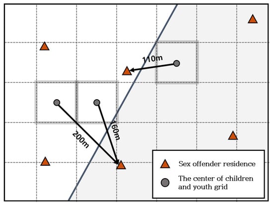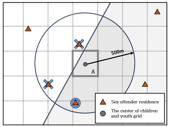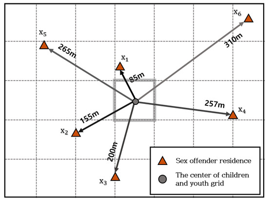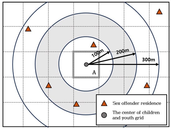 To determine how many sex offenders live near child- and youth-care households, the number of sex offenders living within the area was calculated by expanding the distance in 100 m increments from 100 m to 1 km based on the center point of each grid. In grid A in Figure 2, if the circle denotes the center point of the grid and triangle denotes a sex offender’s residence, then it can be seen that three offenders live within 200 m of grid A. In this way, the number of nearby offenders was calculated for all the grids in Seoul. As the significance of the results varies depending on the number of children and youth within a grid, the average number of sex offenders by distance is calculated by applying the number of children and youth residing in each grid as a weight. The specific formula used in this study is notated as follows: