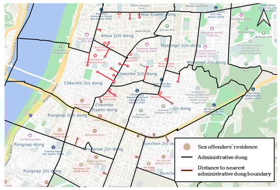 The need to consider the distance standards when setting the scope can also be identified in the issue of sex offender notifications. In the Republic of Korea, sex offenders’ information is distributed via physical mail in only a few regions. Currently, the information of sex offenders is distributed to households and institutions that protect children and youth in the administrative Dong where the offender resides. Sex offenders are more likely to commit crimes in familiar places than unfamiliar places [], and more than half of sex crimes against minors occur near the offender’s residence []. However, the administrative Dong-based information notification system has a limitation in that the information is not delivered to residents who actually need the information. This is because even if the offenders reside in an adjacent building, their information cannot be received by residents unless the offender is residing within the same administrative Dong.