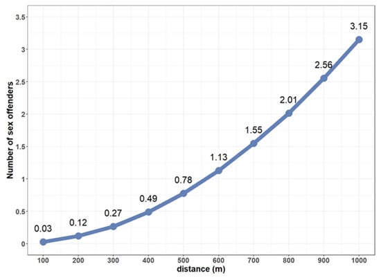 To ascertain how many sex offenders resided near child- and youth-care households, the average number of sex offenders residing within the area in 100 m increments from 100 m to 1 km was calculated. The analysis revealed that the average number of sex offenders residing within 1 km—alternatively, within a 15 min walk—from child- and youth-care households is three (Figure 7).